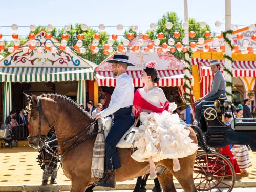 The fairground is a city within a city, featuring over 40 "casetas" (traditional tents) hosted by Andalusian cultural associations. Unlike other private fairs, these booths are open to everyone, offering a welcoming atmosphere where the sound of Sevillanas and the rhythm of flamenco heels fill the air. Expect to see the grounds filled with women in colourful flamenco dresses and riders in traditional equestrian attire.